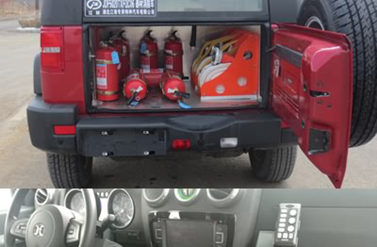JDF5020TXFQC06采用北汽BJ2022F7VNB型越野乘用車改裝,采用北京汽車動力總成有限公司生產的B201R型汽油發(fā)動機,額定功率150kw,發(fā)動機前置,軸距2730mm,底盤**允許總質量為2315kg。配備干粉滅火器,消防水帶,消防水**,地上扳手等常規(guī)消防器材。同時也可配備通訊指揮設備用于通訊指揮,車上配備背負式壓縮空氣泡沫滅火裝置、快速滅火套裝、手動破拆工具組用于消防值勤。 |