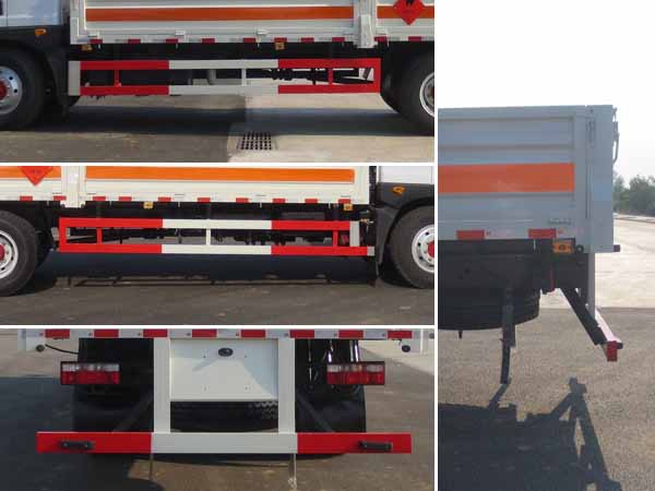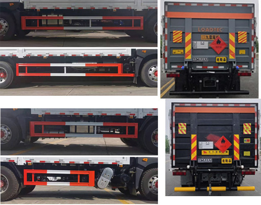 | 隨底盤選裝駕駛室;隨底盤選裝燃油箱,電瓶,尿素罐,儲氣筒左右安裝位置;選裝鋁合金油箱.額定載質(zhì)量(kg)/整備質(zhì)量(kg)/準(zhǔn)乘人數(shù)(人)對應(yīng)關(guān)系為:10950/6855/3,11015/6855/2,11500/6305/3,11565/6305/2;選裝箱體結(jié)構(gòu),選裝柵欄;選裝起重尾板(起重尾板收起狀態(tài)水平長度為290mm),尾板質(zhì)量為550kg;選裝不同廠家尾板及尾板樣式;該車選裝ETC車載裝置;該車用于運(yùn)輸具有**容器(瓶)包裝的易燃?xì)怏w、非易燃無毒氣體;類項(xiàng)號:2.1,2.2;該車為危險(xiǎn)品貨物運(yùn)輸車;僅采用前輪盤式制動器,前置排氣管,子午線輪胎,限速裝置的底盤,限速80km/h;后軸為空氣懸架;轉(zhuǎn)向輪安裝爆胎應(yīng)急防護(hù)裝置;發(fā)動機(jī)B6.2NS6B230,D4.5NS6B220,YCS04200-68,CY4SK761油耗申報(bào)值均為26.6L/100km;該車安裝具有衛(wèi)星定位功能的行駛記錄儀;EBS型號:EBS/ESC-d,生產(chǎn)企業(yè):襄陽東風(fēng)隆誠機(jī)械有限責(zé)任公司;側(cè)面防護(hù)及后下部防護(hù)裝置材料材質(zhì):Q235,連接方式:焊接加螺栓連接;后下部防護(hù)裝置斷面尺寸(寬×高):50×120(mm),離地高度:485mm,選裝起重尾板時(shí),后下部防護(hù)裝置斷面尺寸(直徑):Φ120(mm),離地高度:460mm. | |||