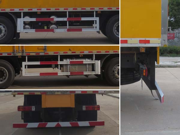 | 廂體頂部封閉,不可開啟;隨底盤選裝駕駛室;廂體側(cè)面選裝開門型式和位置;選裝瓦楞板結(jié)構(gòu)廂體;選裝后部雙拉桿結(jié)構(gòu);選裝起重尾板,尾板質(zhì)量為550kg;起重尾板收起狀態(tài)水平長(zhǎng)度為290mm;該車選裝ETC車載裝置;運(yùn)輸介質(zhì)類項(xiàng)號(hào)為:3;該車為危險(xiǎn)品貨物運(yùn)輸車;僅采用前輪盤式制動(dòng)器,前置排氣管,子午線輪胎,限速裝置的底盤,限速80km/h;后軸為空氣懸架;轉(zhuǎn)向輪安裝爆胎應(yīng)急防護(hù)裝置;發(fā)動(dòng)機(jī)/油耗申報(bào)值(L/100km)對(duì)應(yīng)關(guān)系為:YCK09400-60/37.6;該車安裝具有衛(wèi)星定位功能的行駛記錄儀;EBS型號(hào)/企業(yè): EBS3 /威伯科汽車**系統(tǒng)(**)有限公司;側(cè)面防護(hù)及后下部防護(hù)裝置材料材質(zhì):Q235,連接方式:焊接;后下部防護(hù)裝置斷面尺寸(寬×高):60×120(mm),離地高度:430mm;選裝起重尾板時(shí),后防護(hù)結(jié)構(gòu)連接方式:焊接加螺栓連接,斷面尺寸(直徑):Φ120mm,離地高度:460mm. | |||
