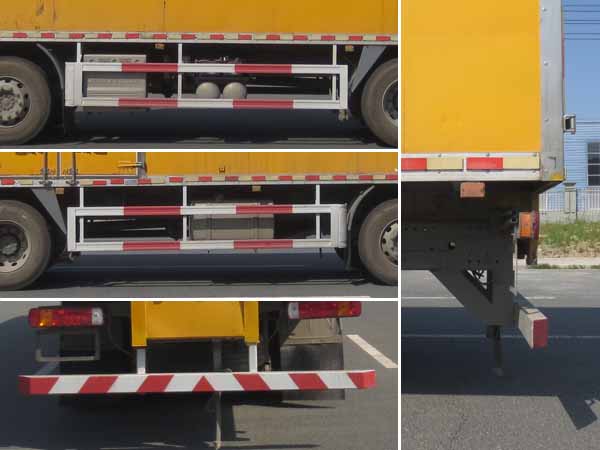 | 廂體頂部封閉,不可開啟;隨底盤選裝駕駛室;廂體側(cè)面選裝開門型式和位置;選裝瓦楞板機構(gòu)廂體以及開門型式和位置,選裝后部雙拉桿結(jié)構(gòu);選裝起重尾板,尾板質(zhì)量為550kg,起重尾板收起狀態(tài)水平長度為290mm;該車型可選裝ETC車載裝置;額定載質(zhì)量(kg)/整備質(zhì)量(kg)/準乘人數(shù)(人)對應關系為:20070/11800/2,20005/11800/3,20520/11350/2,20455/11350/3;運輸**容器(瓶)包裝的貨物;危險貨物類項號:3;該車為危險品貨物運輸車;僅采用前輪盤式制動器,前置排氣管,子午線輪胎,限速裝置的底盤,限速80km/h;后軸為空氣懸架;轉(zhuǎn)向輪安裝爆胎應急防護裝置;發(fā)動機/油耗申報值(L/100km)對應關系為:MC07.31-60/38.0,MC07.34-60/38.0,MC09.35-60/38.0,MC09.38-60/38.0,MC09.35B-60/38.0,MC07H.35-60/38.0;該車安裝具有衛(wèi)星定位功能的行駛記錄儀;ABS系統(tǒng)**器生產(chǎn)企業(yè)/型號為威伯科(上海)管理有限公司/4460046300;選裝EBS,EBS系統(tǒng)**器生產(chǎn)企業(yè)/型號為威伯科(上海)管理有限公司/EBS3;側(cè)面防護及后下部防護裝置材料材質(zhì):Q235,連接方式:焊接;后下部防護裝置斷面尺寸(寬×高):60×120(mm),離地高度:460mm.選裝圓形后防護,連接方式:焊接加螺栓連接;斷面尺寸(直徑):120(mm),離地高度:460mm. | |||