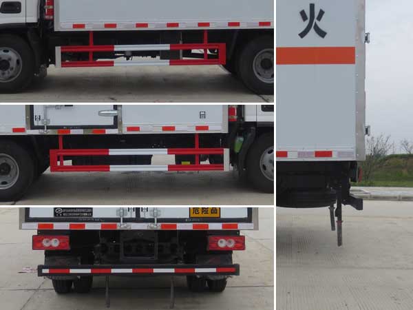 | 廂體頂部封閉,不可開啟;隨底盤選裝駕駛室;廂體側(cè)面選裝開門型式及位置,選裝不帶側(cè)開門,選裝瓦楞板結(jié)構(gòu);選裝起重尾板(收起狀態(tài)水平長度為280mm),尾板質(zhì)量為350kg;該車型可選裝ETC車載裝置;運輸具有**容器(瓶)包裝的貨物,類項號:3;該車為危險品貨物運輸車;僅采用前輪盤式制動器,前置排氣管,子午線輪胎,限速裝置的底盤,限速80km/h;轉(zhuǎn)向輪安裝爆胎應(yīng)急防護裝置;發(fā)動機F2.8NS6B131,Q28-130E60,F2.8NS6B150,D30TCIF1,F3.8NS6B156,CY4SK261,4J28TC6,F2.8NS6B156,Q28-130C60對應(yīng)油耗申報值均為11.1L/100km;該車安裝具有衛(wèi)星定位功能的行駛記錄儀;ABS系統(tǒng)型號:ABS-VI.E;生產(chǎn)企業(yè):廣州瑞立科密汽車電子股份有限公司.ABS系統(tǒng)型號:ABS-E;生產(chǎn)企業(yè):威伯科汽車**系統(tǒng)(**)有限公司;側(cè)面防護及后下部防護裝置材料材質(zhì):Q235,連接方式:焊接加螺栓連接;后下部防護裝置斷面尺寸(寬×高):50×100(mm),離地高度:460mm. | |||