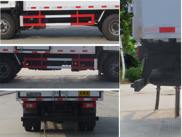 | 廂體頂部封閉,不可開(kāi)啟;隨底盤(pán)選裝駕駛室;廂體選裝瓦楞板結(jié)構(gòu),廂體側(cè)面選裝開(kāi)門(mén)型式及位置或不帶側(cè)開(kāi)門(mén),選裝百葉窗;選裝起重尾板(收起狀態(tài)水平長(zhǎng)度為290mm),尾板質(zhì)量為450kg;該車(chē)用于運(yùn)輸具有**容器(瓶)包裝的危險(xiǎn)貨物類(lèi)項(xiàng)號(hào):3;該車(chē)為危險(xiǎn)品貨物運(yùn)輸車(chē);僅采用前輪盤(pán)式制動(dòng)器,前置排氣管,子午線輪胎,限速裝置的底盤(pán),限速80km/h;轉(zhuǎn)向輪安裝爆胎應(yīng)急防護(hù)裝置;發(fā)動(dòng)機(jī)/油耗申報(bào)值(L/100km)對(duì)應(yīng)關(guān)系為:F3.8NS6B156/16.20,CY4SK261/16.09,D30TCIF1/16.19,F2.8NS6B156/15.39;該車(chē)安裝具有衛(wèi)星定位功能的行駛記錄儀;ABS系統(tǒng)型號(hào):ABS-VI.E;生產(chǎn)企業(yè):廣州瑞立科密汽車(chē)電子股份有限公司.ABS系統(tǒng)型號(hào):ABS-E;生產(chǎn)企業(yè):威伯科汽車(chē)**系統(tǒng)(**)有限公司;側(cè)面防護(hù)及后下部防護(hù)裝置材料材質(zhì):Q235,連接方式:焊接加螺栓連接;后下部防護(hù)裝置斷面尺寸(寬×高):50×100(mm),離地高度:460mm.選裝圓形后防護(hù),連接方式:焊接加螺栓連接;后下部防護(hù)裝置斷面尺寸為:Φ110mm,離地高度:410mm;該車(chē)型可選裝ETC車(chē)載裝置. | |||