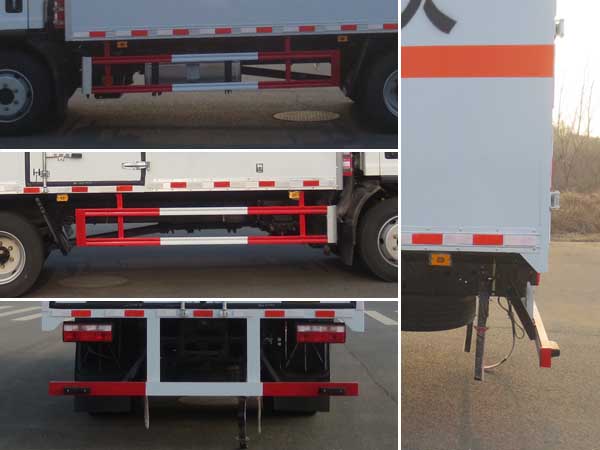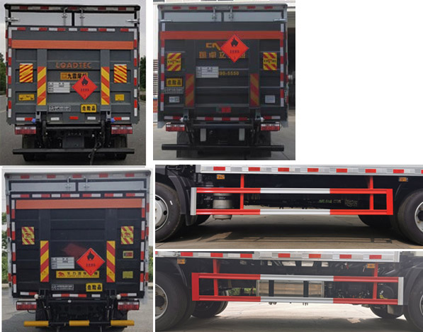 | 廂體頂部封閉,不可開啟;隨底盤選裝駕駛室;選裝底盤附件及油箱左右安裝位置;僅采用底盤3900mm軸距;廂體選裝瓦楞板結(jié)構(gòu),廂體側(cè)面選裝開門型式及位置或不帶側(cè)開門,選裝百葉窗;選裝起重尾板(收起狀態(tài)水平長度為290mm),尾板質(zhì)量為450kg;選裝不同廠家尾板以及尾板外觀;運輸介質(zhì)類項號:3;該車為危險品貨物運輸車;僅采用前輪盤式制動器,前置排氣管,子午線輪胎,限速裝置的底盤,限速80km/h;轉(zhuǎn)向輪安裝爆胎應(yīng)急防護裝置;發(fā)動機/油耗申報值(L/100km)對應(yīng)關(guān)系為:WP3NQ160E61/20.8,CA4DD1-16E6/20.8;該車安裝具有衛(wèi)星定位功能的行駛記錄儀;ABS生產(chǎn)廠家/型號:1.廣州瑞立科密汽車電子股份有限公司/CM4XL-4S/4M;2.浙江萬安科技股份有限公司/VIE ABS-II;側(cè)面防護及后下部防護裝置材料材質(zhì):Q235,連接方式:焊接加螺栓連接;后下部防護裝置斷面尺寸(寬×高):50×100(mm),離地高度:480mm;選裝起重尾板時,后防護為圓形結(jié)構(gòu),后下部防護裝置材料材質(zhì):Q235,連接方式:焊接加螺栓連接;后下部防護裝置斷面尺寸(直徑):Φ120(mm),離地高度:480mm.該車選裝ETC車載裝置. | |||