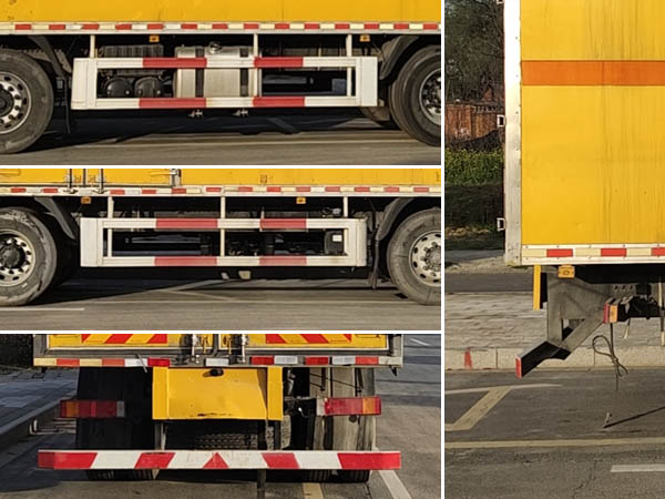 | 廂體頂部封閉,不可開啟;隨底盤選裝駕駛室,隨底盤選裝蓄電池及儲氣筒可選裝右置;選裝廂體開門型式及位置;選裝瓦楞板結構廂體;選裝后部雙拉桿結構;選裝起重尾板,尾板質量為550kg;起重尾板收起狀態(tài)水平長度為290mm;該車用于運輸具有**容器(瓶)包裝的危險貨物類項號為:9;僅采用前輪盤式制動器,前置排氣管,子午線輪胎,限速裝置的底盤,限速80km/h;后軸為空氣懸架;轉向輪安裝爆胎應急防護裝置;該車選裝ETC車載裝置;發(fā)動機/油耗值(L/100km)對應關系為:DDi75E350-60/38.1,L9NS6B400/38.2;該車安裝具有衛(wèi)星定位功能的行駛記錄儀;EBS型號/生產廠家:EBS5/東科克諾爾商用車制動系統(tǒng)(十堰)有限公司;側面防護及后下部防護裝置材料材質:Q235,連接方式:焊接連接;后下部防護裝置斷面尺寸(寬×高):60×120(mm),離地高度:495mm;選裝起重尾板時,后防護結構連接方式:焊接加螺栓連接,斷面尺寸(直徑):Φ120mm,離地高度:460mm. | |||