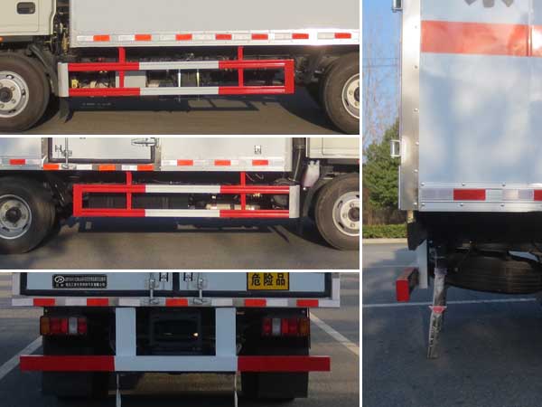 | 廂體頂部封閉,不可開啟;廂體選裝瓦楞板結(jié)構(gòu),廂體側(cè)面選裝開門型式及位置或不帶側(cè)開門,選裝百葉窗;運輸介質(zhì)類項號為:9;該車為危險品貨物運輸車;僅采用前輪盤式制動器,前置排氣管,子午線輪胎,限速裝置的底盤,限速80km/h;轉(zhuǎn)向輪安裝爆胎應(yīng)急防護(hù)裝置;發(fā)動機與油耗申報值(L/100km)對應(yīng)關(guān)系為:JX4D30B6H/11.1,JX4D30A6H/11.4,JX4D30C6H/11.4;該車安裝具有衛(wèi)星定位功能的行駛記錄儀;液剎ABS系統(tǒng)型號:APG3550500A,ABS系統(tǒng)生產(chǎn)廠家:浙江亞太機電股份有限公司;氣剎ABS系統(tǒng)型號: VIE ABS-II,ABS系統(tǒng)生產(chǎn)廠家: 浙江萬安科技股份有限公司;側(cè)面防護(hù)及后下部防護(hù)裝置材料材質(zhì):Q235,連接方式:焊接加螺栓連接;后下部防護(hù)裝置斷面尺寸(寬×高):50×100(mm),離地高度:460mm. | |||