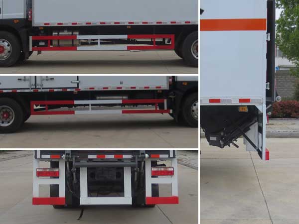 | 廂體頂部封閉,不可開啟;隨底盤選裝駕駛室,隨底盤選裝燃油箱,電瓶,尿素罐,儲氣筒左右安裝位置.起重尾板為選裝件(收起狀態(tài)水平長度為290mm),尾板質(zhì)量為545kg;選裝不同廠家尾板及尾板樣式;廂體側(cè)面選裝開門型式和位置,選裝不帶側(cè)開門;選裝瓦楞板結(jié)構(gòu)廂體及開門型式和位置;選裝后部結(jié)構(gòu);額定載質(zhì)量/整備質(zhì)量(kg)對應(yīng)關(guān)系為:10700/7105,9995/7810;該車用于運輸具有**容器(瓶)包裝的危險貨物類項號:9;僅采用前輪盤式制動器,前置排氣管,子午線輪胎,限速裝置的底盤,限速80km/h;后軸為空氣懸架;轉(zhuǎn)向輪安裝爆胎應(yīng)急防護裝置;發(fā)動機B6.2NS6B230,D4.5NS6B220,YCS04200-68,CY4SK761油耗申報值均為26.6L/100km;該車安裝具有衛(wèi)星定位功能的行駛記錄儀;EBS系統(tǒng)生產(chǎn)廠家,型號:襄陽東風隆誠機械有限責任公司,EBS/ESC-d;側(cè)面防護及后下部防護裝置材料材質(zhì):Q235,連接方式:焊接加螺栓連接;后下部防護裝置斷面尺寸(寬×高):50×120(mm),離地高度:485mm.選裝后防護結(jié)構(gòu),斷面尺寸(直徑):Φ120(mm),離地高度:485mm.該車選裝ETC車載裝置. | |||