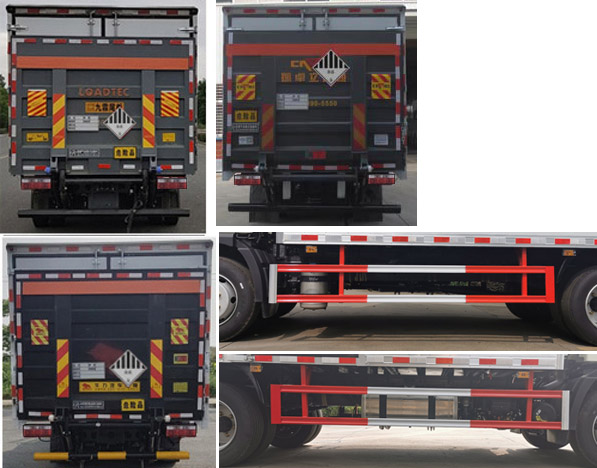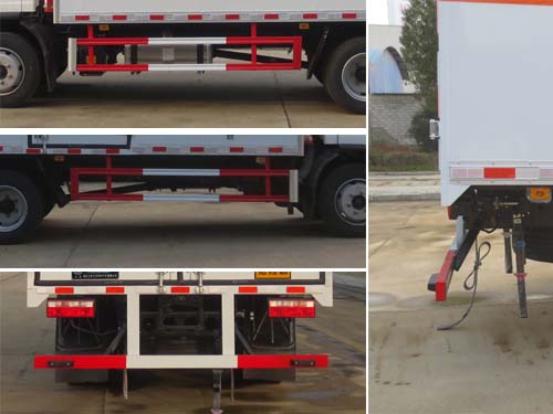 | 廂體頂部封閉,不可開啟;隨底盤選裝駕駛室;選裝底盤附件及油箱左右安裝位置;僅采用底盤3900mm軸距;廂體選裝瓦楞板結(jié)構(gòu),廂體側(cè)面選裝開門型式及位置或不帶側(cè)開門,選裝百葉窗;選裝起重尾板(收起狀態(tài)水平長度為290mm),尾板質(zhì)量為450kg;選裝不同廠家尾板以及尾板外觀;運輸具有**容器(瓶)包裝的介質(zhì)類項號為:9;該車為危險品貨物運輸車;僅采用前輪盤式制動器,前置排氣管,子午線輪胎,限速裝置的底盤,限速80km/h;轉(zhuǎn)向輪安裝爆胎應(yīng)急防護(hù)裝置;發(fā)動機(jī)/油耗申報值(L/100km)對應(yīng)關(guān)系為:WP3NQ160E61/20.8,CA4DD1-16E6/20.8;該車安裝具有衛(wèi)星定位功能的行駛記錄儀;ABS生產(chǎn)廠家/型號:1.廣州瑞立科密汽車電子股份有限公司/CM4XL-4S/4M;2.浙江萬安科技股份有限公司/VIE ABS-II;側(cè)面防護(hù)及后下部防護(hù)裝置材料材質(zhì):Q235,連接方式:焊接加螺栓連接;后下部防護(hù)裝置斷面尺寸(寬×高):50×100(mm),離地高度:480mm;選裝起重尾板時,后防護(hù)為圓形結(jié)構(gòu),后下部防護(hù)裝置材料材質(zhì):Q235,連接方式:焊接加螺栓連接;后下部防護(hù)裝置斷面尺寸(直徑):Φ120(mm),離地高度:420mm.該車選裝ETC車載裝置. | |||