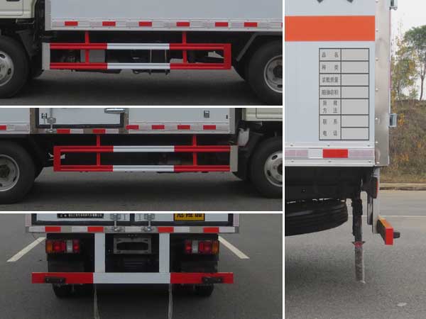 | 廂體頂部封閉,不可開啟;廂體側(cè)面選裝開門型式及位置或不帶側(cè)開門;該車用于運(yùn)輸具有**容器(瓶)包裝的:黑火藥,壓縮黑火藥,電(非電)引爆雷管,爆破用,專用煙火制品,無煙火藥,糊狀火藥,爆破炸藥,導(dǎo)爆索,軟的,點(diǎn)燃導(dǎo)火索,射彈,帶有爆炸裝藥,聚能裝藥,不帶雷管,聚能炸藥,不帶雷管,非電引爆雷管組件,爆破用,油井用彈藥筒,固態(tài)推進(jìn)劑,動(dòng)力裝置用彈藥筒,商品爆炸裝藥,不帶雷管,運(yùn)送爆炸品的項(xiàng)號(hào):1.1 D,1.1 D,1.1B,1.1B,1.1G ,1.1C,1.3C,1.1 D,1.1 D,1.4G,1.1D,1.1 D,1.1B,1.1B,1.3C,1.1C,1.3C,1.1D;運(yùn)送危險(xiǎn)貨物車輛的類型:EX/Ⅲ型車輛;僅采用前輪盤式制動(dòng)器,前置排氣管,子午線輪胎,限速裝置的底盤,限速80km/h;轉(zhuǎn)向輪安裝爆胎應(yīng)急防護(hù)裝置;發(fā)動(dòng)機(jī)/油耗申報(bào)值(L/100km)對(duì)應(yīng)關(guān)系為:JX4D30B6H/11.0,JX4D30A6H/11.1;該車安裝具有衛(wèi)星定位功能的行駛記錄儀;ABS系統(tǒng)型號(hào):APG3550500A,ABS系統(tǒng)生產(chǎn)廠家:浙江亞太機(jī)電股份有限公司;側(cè)面防護(hù)及后下部防護(hù)裝置材料材質(zhì):Q235,連接方式:焊接加螺栓連接;后下部防護(hù)裝置斷面尺寸(寬×高):50×100(mm),離地高度:400mm. | |||