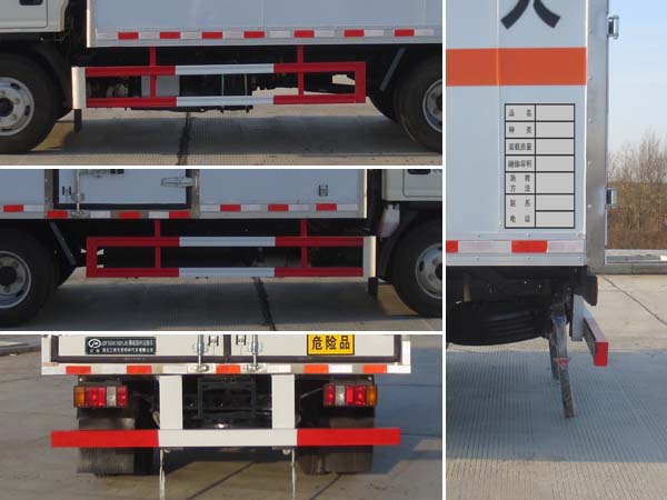 | 廂體頂部封閉,不可開啟;廂體側(cè)面選裝開門型式及位置或不帶側(cè)開門;該車用于運(yùn)輸具有**容器(瓶)包裝的:黑火藥,壓縮黑火藥,電(非電)引爆雷管,爆破用,專用煙火制品,無煙火藥,糊狀火藥,爆破炸藥,導(dǎo)爆索,軟的,點(diǎn)燃導(dǎo)火索,射彈,帶有爆炸裝藥,聚能裝藥,不帶雷管,聚能炸藥,不帶雷管,非電引爆雷管組件,爆破用,油井用彈藥筒,固態(tài)推進(jìn)劑,動(dòng)力裝置用彈藥筒,商品爆炸裝藥,不帶雷管,運(yùn)送爆炸品的項(xiàng)號(hào):1.1 D,1.1 D,1.1B,1.1B,1.1G ,1.1C,1.3C,1.1 D,1.1 D,1.4G,1.1D,1.1 D,1.1B,1.1B,1.3C,1.1C,1.3C,1.1D;運(yùn)送危險(xiǎn)貨物車輛的類型:EX/Ⅱ型車輛;僅采用前輪盤式制動(dòng)器,前置排氣管,子午線輪胎,限速裝置的底盤,限速80km/h;轉(zhuǎn)向輪安裝爆胎應(yīng)急防護(hù)裝置;發(fā)動(dòng)機(jī)與油耗申報(bào)值(L/100km)對(duì)應(yīng)關(guān)系為:JX4D30B6H/11.1,JX4D30A6H/11.4,JX4D30C6H/11.4;該車安裝具有衛(wèi)星定位功能的行駛記錄儀;液剎ABS系統(tǒng)型號(hào):APG3550500A,ABS系統(tǒng)生產(chǎn)廠家:浙江亞太機(jī)電股份有限公司;氣剎ABS系統(tǒng)型號(hào): VIE ABS-II,ABS系統(tǒng)生產(chǎn)廠家: 浙江萬安科技股份有限公司;側(cè)面防護(hù)及后下部防護(hù)裝置材料材質(zhì):Q235,連接方式:焊接加螺栓連接;后下部防護(hù)裝置斷面尺寸(寬×高):50×100(mm),離地高度:460mm. | |||