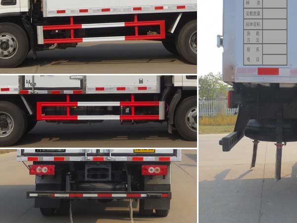 | 廂體頂部封閉,不可開啟;廂體側(cè)面選裝開門型式及位置或不帶側(cè)開門;該車用于運(yùn)輸具有**容器(瓶)包裝的危險(xiǎn)貨物類項(xiàng)號為:1.1 D,1.1B,1.1G ,1.1C,1.3C,1.4G,1.3C,1.1C;運(yùn)送危險(xiǎn)貨物車輛的類型:EX/Ⅲ型車輛;僅采用前輪盤式制動器,前置排氣管,子午線輪胎,限速裝置的底盤,限速80km/h;轉(zhuǎn)向輪安裝爆胎應(yīng)急防護(hù)裝置;發(fā)動機(jī)/油耗申報(bào)值(L/100km)對應(yīng)關(guān)系為:F3.8NS6B156/16.20,CY4SK261/16.09,D30TCIF1/16.19,F2.8NS6B156/15.39;該車安裝具有衛(wèi)星定位功能的行駛記錄儀;ABS系統(tǒng)型號:ABS-VI.E;生產(chǎn)企業(yè):廣州瑞立科密汽車電子股份有限公司.ABS系統(tǒng)型號:ABS-E;生產(chǎn)企業(yè):威伯科汽車**系統(tǒng)(**)有限公司;側(cè)面防護(hù)及后下部防護(hù)裝置材料材質(zhì):Q235,連接方式:焊接加螺栓連接;后下部防護(hù)裝置斷面尺寸(寬×高):50×100(mm),離地高度:460mm;該車型可選裝ETC車載裝置. | |||