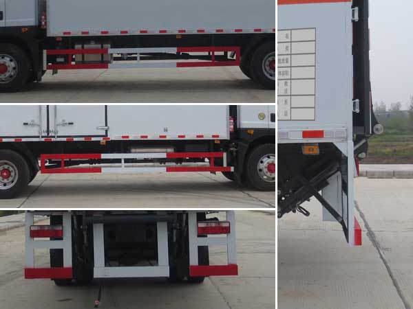 | 廂體頂部封閉,不可開啟;隨底盤選裝駕駛室;選裝燃油箱,電瓶,尿素罐,儲氣筒左右安裝位置,選裝鋁合金油箱;該車型可選裝ETC車載裝置;起重尾板為選裝件(收起狀態(tài)水平長度為290mm),尾板質(zhì)量為545kg;廂體側(cè)面選裝開門型式和位置,選裝不帶側(cè)開門;額定載質(zhì)量/整備質(zhì)量(kg)對應關系為:10700/7105,9995/7810;該車用于運輸具有**容器(瓶)包裝的危險品貨物類項號:1.1 D,1.1B,1.1G ,1.1C,1.3C,1.4G;運送危險貨物車輛的類型:EX/Ⅲ型車輛;僅采用前輪盤式制動器,前置排氣管,子午線輪胎,限速裝置的底盤,限速80km/h;后軸為空氣懸架;轉(zhuǎn)向輪安裝爆胎應急防護裝置;發(fā)動機B6.2NS6B230,D4.5NS6B220,YCS04200-68,CY4SK761油耗申報值均為26.6L/100km;該車安裝具有衛(wèi)星定位功能的行駛記錄儀;EBS系統(tǒng)生產(chǎn)廠家,型號:襄陽東風隆誠機械有限責任公司,EBS/ESC-d;側(cè)面防護及后下部防護裝置材料材質(zhì):Q235,連接方式:焊接加螺栓連接;后下部防護裝置斷面尺寸(寬×高):50×120(mm),離地高度:485mm. | |||