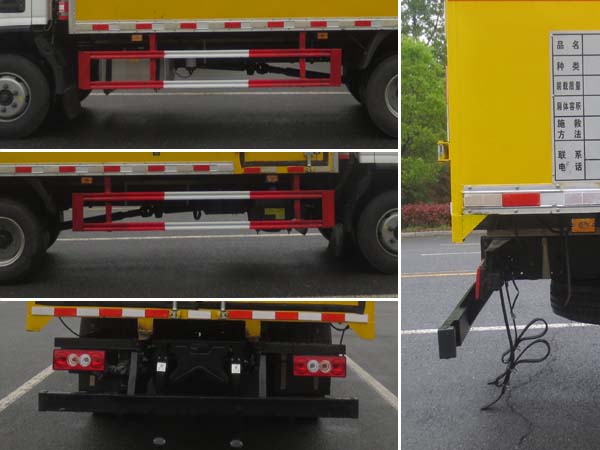 | 廂體頂部封閉,不可開啟;隨底盤選裝駕駛室;僅采用底盤3800mm軸距;廂體側(cè)面選裝開門型式及位置或不帶側(cè)開門;該車用于運(yùn)輸具有**容器(瓶)包裝的危險(xiǎn)貨物類項(xiàng)號(hào):1.1 D,1.1B,1.1G ,1.1C,1.3C,1.4G;運(yùn)送危險(xiǎn)貨物車輛的類型:EX/Ⅲ型車輛;僅采用前輪盤式制動(dòng)器,前置排氣管,子午線輪胎,限速裝置的底盤,限速80km/h;轉(zhuǎn)向輪安裝爆胎應(yīng)急防護(hù)裝置;發(fā)動(dòng)機(jī)與油耗申報(bào)值(L/100km)對(duì)應(yīng)關(guān)系為:F3.8NS6B156/18.0;該車安裝具有衛(wèi)星定位功能的行駛記錄儀;ABS系統(tǒng)**器型號(hào)/生產(chǎn)企業(yè):ABS-E/威伯科汽車**系統(tǒng)(**)有限公司,ABS-VI·E/廣州瑞立科密汽車電子股份有限公司;側(cè)面防護(hù)及后下部防護(hù)裝置材料材質(zhì):Q235,側(cè)面防護(hù)連接方式:焊接連接;后下部防護(hù)裝置連接方式:焊接加螺栓連接,斷面尺寸(寬×高):65×120(mm),離地高度:475mm;該車選裝ETC車載裝置. | |||