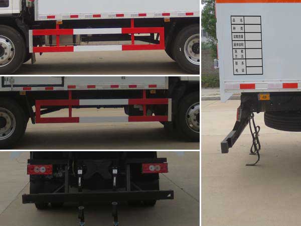 | 廂體頂部封閉,不可開啟;隨底盤選裝駕駛室,選裝儲(chǔ)氣筒內(nèi)置;廂體側(cè)面選裝開門型式及位置或不帶側(cè)開門;運(yùn)輸介質(zhì)類項(xiàng)號(hào)為:1.1,1.3,1.4;運(yùn)送危險(xiǎn)貨物車輛的類型:EX/Ⅲ型車輛;僅采用前輪盤式制動(dòng)器,前置排氣管,子午線輪胎,限速裝置的底盤,限速80km/h;轉(zhuǎn)向輪安裝爆胎應(yīng)急防護(hù)裝置;發(fā)動(dòng)機(jī)/油耗申報(bào)值(L/100km)對(duì)應(yīng)關(guān)系為:F3.8NS6B156/21.02,D30TCIF1/20.39;該車安裝具有衛(wèi)星定位功能的行駛記錄儀;ABS系統(tǒng)型號(hào):ABS-VI.E;生產(chǎn)企業(yè):廣州瑞立科密汽車電子股份有限公司.ABS系統(tǒng)型號(hào):ABS-E;生產(chǎn)企業(yè):威伯科汽車**系統(tǒng)(**)有限公司;側(cè)面防護(hù)及后下部防護(hù)裝置材料材質(zhì):Q235,連接方式:焊接加螺栓連接;后下部防護(hù)裝置斷面尺寸(寬×高):50×100(mm),離地高度:420mm. | |||