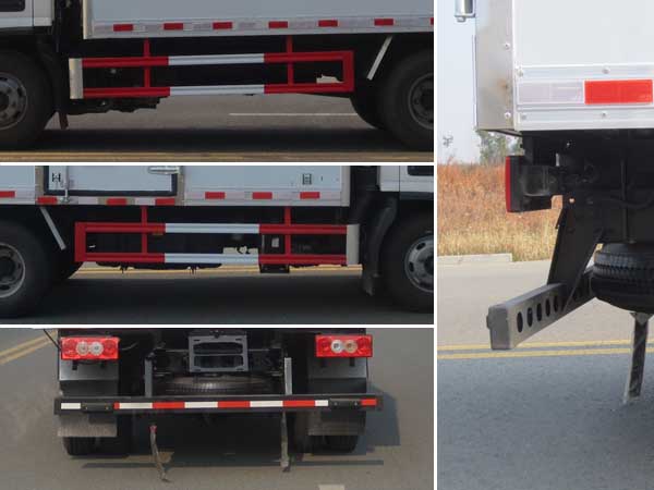 | 廂體頂部封閉,不可開啟;廂體側(cè)面選裝開門型式及位置,選裝不帶側(cè)開門,選裝瓦楞板結(jié)構(gòu);選裝起重尾板(收起狀態(tài)水平長度為290mm),尾板質(zhì)量為450kg;該車用于運輸具有**容器(瓶)包裝的危險貨物類項號為:2.1,2.2;該車為危險品貨物運輸車;僅采用前輪盤式制動器,前置排氣管,子午線輪胎,限速裝置的底盤,限速80km/h;發(fā)動機/油耗申報值(L/100km)對應(yīng)關(guān)系為:F3.8NS6B156/16.20,CY4SK261/16.09,D30TCIF1/16.19,F2.8NS6B156/15.39;該車安裝具有衛(wèi)星定位功能的行駛記錄儀;ABS系統(tǒng)型號:ABS-VI.E;生產(chǎn)企業(yè):廣州瑞立科密汽車電子股份有限公司.ABS系統(tǒng)型號:ABS-E;生產(chǎn)企業(yè):威伯科汽車**系統(tǒng)(**)有限公司;側(cè)面防護(hù)及后下部防護(hù)裝置材料材質(zhì):Q235,連接方式:焊接加螺栓連接;后下部防護(hù)裝置斷面尺寸(寬×高):50×100(mm),離地高度:460mm;選裝圓形后防護(hù),連接方式:焊接加螺栓連接;后下部防護(hù)裝置斷面尺寸為:Φ110mm,離地高度:410mm;該車選裝ETC. | |||