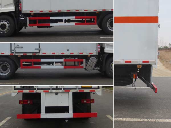 | 廂體頂部封閉,不可開(kāi)啟;隨底盤(pán)選裝駕駛室,選裝后處理隔熱罩;選裝起重尾板(收起狀態(tài)水平長(zhǎng)度為290mm),尾板質(zhì)量為545kg;選裝不同廠家尾板及尾板樣式;廂體側(cè)面選裝開(kāi)門(mén)型式和位置,選裝不帶側(cè)開(kāi)門(mén);選裝瓦楞板結(jié)構(gòu)及開(kāi)門(mén)型式,選裝后部結(jié)構(gòu);額定載質(zhì)量/整備質(zhì)量(kg)對(duì)應(yīng)關(guān)系為:10600/7205,9995/7810;運(yùn)輸**容器(瓶)包裝的貨物;危險(xiǎn)貨物類(lèi)項(xiàng)號(hào):2.1,2.2;僅采用前輪盤(pán)式制動(dòng)器,前置排氣管,子午線(xiàn)輪胎,限速裝置的底盤(pán),限速80km/h;后軸為空氣懸架;轉(zhuǎn)向輪安裝爆胎應(yīng)急防護(hù)裝置; 發(fā)動(dòng)機(jī)/油耗申報(bào)值(L/100km)對(duì)應(yīng)關(guān)系為:B6.2NS6B210/25.9,DDi50E190-60/25.9;該車(chē)安裝具有衛(wèi)星定位功能的行駛記錄儀;EBS型號(hào)/生產(chǎn)廠家:EBS5/東科克諾爾商用車(chē)制動(dòng)系統(tǒng)(十堰)有限公司;側(cè)面防護(hù)及后下部防護(hù)裝置材料材質(zhì):Q235,連接方式:焊接加螺栓連接;后下部防護(hù)裝置斷面尺寸(寬×高):50×120(mm),離地高度:495mm;選裝起重尾板時(shí),后下部防護(hù)裝置斷面尺寸(直徑):Φ120(mm),離地高度:495mm;該車(chē)型可選裝ETC車(chē)載裝置. | |||