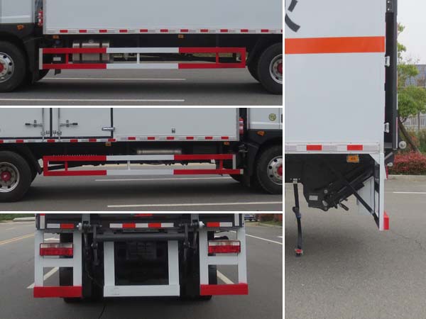 | 廂體頂部封閉,不可開啟;隨底盤選裝駕駛室;選裝燃油箱,電瓶,尿素罐,儲氣筒左右安裝位置.起重尾板為選裝件(收起狀態(tài)水平長度為290mm),尾板質(zhì)量為545kg;選裝不同廠家尾板及尾板樣式;廂體側(cè)面選裝開門型式和位置,選裝不帶側(cè)開門;選裝瓦楞板結(jié)構(gòu)廂體及開門型式和位置;選裝后部結(jié)構(gòu);額定載質(zhì)量/整備質(zhì)量(kg)對應(yīng)關(guān)系為:10700/7105,9995/7810;該車用于運(yùn)輸具有**容器(瓶)包裝的危險(xiǎn)貨物類項(xiàng)號:2.1,2.2;僅采用前輪盤式制動器,前置排氣管,子午線輪胎,限速裝置的底盤,限速80km/h;后軸為空氣懸架;轉(zhuǎn)向輪安裝爆胎應(yīng)急防護(hù)裝置;發(fā)動機(jī)B6.2NS6B230,D4.5NS6B220,YCS04200-68,CY4SK761油耗申報(bào)值均為26.6L/100km;該車安裝具有衛(wèi)星定位功能的行駛記錄儀;EBS型號:EBS/ESC-d,生產(chǎn)企業(yè):襄陽東風(fēng)隆誠機(jī)械有限責(zé)任公司;側(cè)面防護(hù)及后下部防護(hù)裝置材料材質(zhì):Q235,連接方式:焊接加螺栓連接;后下部防護(hù)裝置斷面尺寸(寬×高):50×120(mm),離地高度:485mm.選裝圓形后防護(hù),斷面尺寸(直徑):Φ120(mm),離地高度:485mm.該車選裝ETC車載裝置. | |||