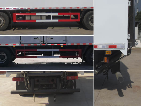 | 車廂頂部封閉不可開啟;EBS時配備盤式制動器、B6.2NS6B245發(fā)動機,EBS型號/廠家:EBS5/東科克諾爾商用車制動系統(tǒng)(十堰)有限公司;安裝有限速裝置;限速裝置限速(km/h):80;安裝有具有衛(wèi)星定位功能的行駛記錄儀;選裝描述:隨底盤選裝駕駛室,選裝后處理隔熱罩;選裝廂體開門型式及位置;選裝瓦楞板結構廂體以及開門型式和位置;,選裝后部結構;選裝不帶起重尾板,尾板質量為550kg;選裝不同廠家尾板及尾板樣式;該車選裝ETC車載裝置;發(fā)動機/油耗值(L/100km)對應關系為:B6.2NS6B230/36,B6.2NS6B245/36;整備質量(kg)/額定載質量(kg)/準乘人數(人)對應關系為:9300/16070/2,9300/16005/3,9600/15770/2,9600/15705/3;所用材料材質、連接方式以及后部防護裝置的主要尺寸參數(斷面尺寸和離地高度):側面防護及后下部防護裝置材料材質:Q235,側面防護連接方式:焊接連接;后下部防護裝置連接方式:焊接加螺栓連接,斷面尺寸(直徑):Φ120mm,離地高度:450mm;選裝不帶尾板時,后下部防護裝置斷面尺寸(寬×高):60×120(mm),離地高度:450mm;尾板、上下坡道(或類似裝置)收起狀態(tài)的水平長度(mm):起重尾板收起狀態(tài)水平長度為290mm;運輸**容器(瓶)包裝的貨物;危險貨物類項號:2.1,2.2;其他說明:該車為危險品貨物運輸車;僅采用前輪盤式制動器,前置排氣管,子午線輪胎;后軸為空氣懸架;轉向輪安裝爆胎應急防護裝置; | |||