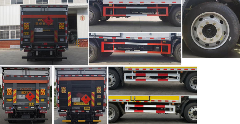 | 廂體頂部封閉,不可開啟;隨底盤選裝駕駛室,選裝輪輞樣式,選裝燃油箱,電瓶,尿素罐,儲氣筒左右安裝位置;選裝起重尾板(收起狀態(tài)水平長度為290mm),尾板質量為450kg;選裝不同廠家尾板以及尾板外觀;廂體選裝瓦楞板結構,廂體側面選裝開門型式及位置或不帶側開門,選裝百葉窗;僅采用底盤3800mm軸距;運輸介質類項號為:2.1,2.2;該車為危險品貨物運輸車;僅采用前輪盤式制動器,前置排氣管,子午線輪胎,限速裝置的底盤,限速80km/h;轉向輪安裝爆胎應急防護裝置;發(fā)動機YCS04190-68,D25TCIF1,D30TCIF1,D40TCIF1,NV30-C6D,CY4SK261,CY4SK361,YCY30165-60對應油耗申報值均為:21.3L/100km;該車安裝具有衛(wèi)星定位功能的行駛記錄儀;ABS型號/廠家:ABS型號:ABS/ASR-24V-4S/4M,廠家:襄陽東風隆誠機械有限責任公司;側面防護及后下部防護裝置材料材質:Q235,連接方式:焊接加螺栓連接;后下部防護裝置斷面尺寸(寬×高):45×100(mm),離地高度:460mm;選裝圓形后防護,連接方式:焊接加螺栓連接;后下部防護裝置斷面尺寸為:Φ110mm,離地高度:400mm;該車型可選裝ETC車載裝置. | |||