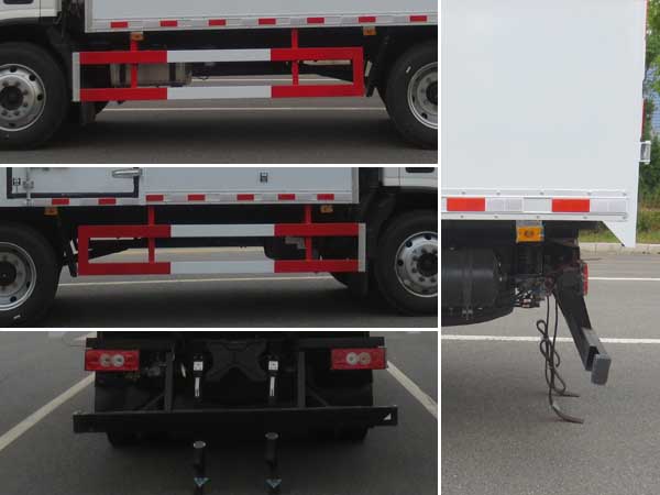 | 廂體頂部封閉,不可開啟;隨底盤選裝駕駛室,選裝儲(chǔ)氣筒內(nèi)置;選裝起重尾板(收起狀態(tài)水平長(zhǎng)度為290mm),尾板質(zhì)量為450kg;選裝不同廠家尾板及尾板樣式;廂體選裝瓦楞板結(jié)構(gòu),廂體側(cè)面選裝開門型式及位置或不帶側(cè)開門,選裝百葉窗;該車型可選裝ETC車載裝置;該車用于運(yùn)輸具有**容器(瓶)包裝的危險(xiǎn)貨物類項(xiàng)號(hào)為:2.1,2.2;該車為危險(xiǎn)品貨物運(yùn)輸車;僅采用前輪盤式制動(dòng)器,前置排氣管,子午線輪胎,限速裝置的底盤,限速80km/h;轉(zhuǎn)向輪安裝爆胎應(yīng)急防護(hù)裝置;發(fā)動(dòng)機(jī)/油耗申報(bào)值(L/100km)對(duì)應(yīng)關(guān)系為:F3.8NS6B156/21.02,D30TCIF1/20.39;該車安裝具有衛(wèi)星定位功能的行駛記錄儀;ABS系統(tǒng)型號(hào):ABS-VI.E;生產(chǎn)企業(yè):廣州瑞立科密汽車電子股份有限公司.ABS系統(tǒng)型號(hào):ABS-E;生產(chǎn)企業(yè):威伯科汽車**系統(tǒng)(**)有限公司;側(cè)面防護(hù)及后下部防護(hù)裝置材料材質(zhì):Q235,連接方式:焊接加螺栓連接;后下部防護(hù)裝置斷面尺寸(寬×高):50×100(mm),離地高度:420mm;選裝圓形后防護(hù),連接方式:焊接加螺栓連接;后下部防護(hù)裝置斷面尺寸為:Φ120mm,離地高度:420mm; | |||
